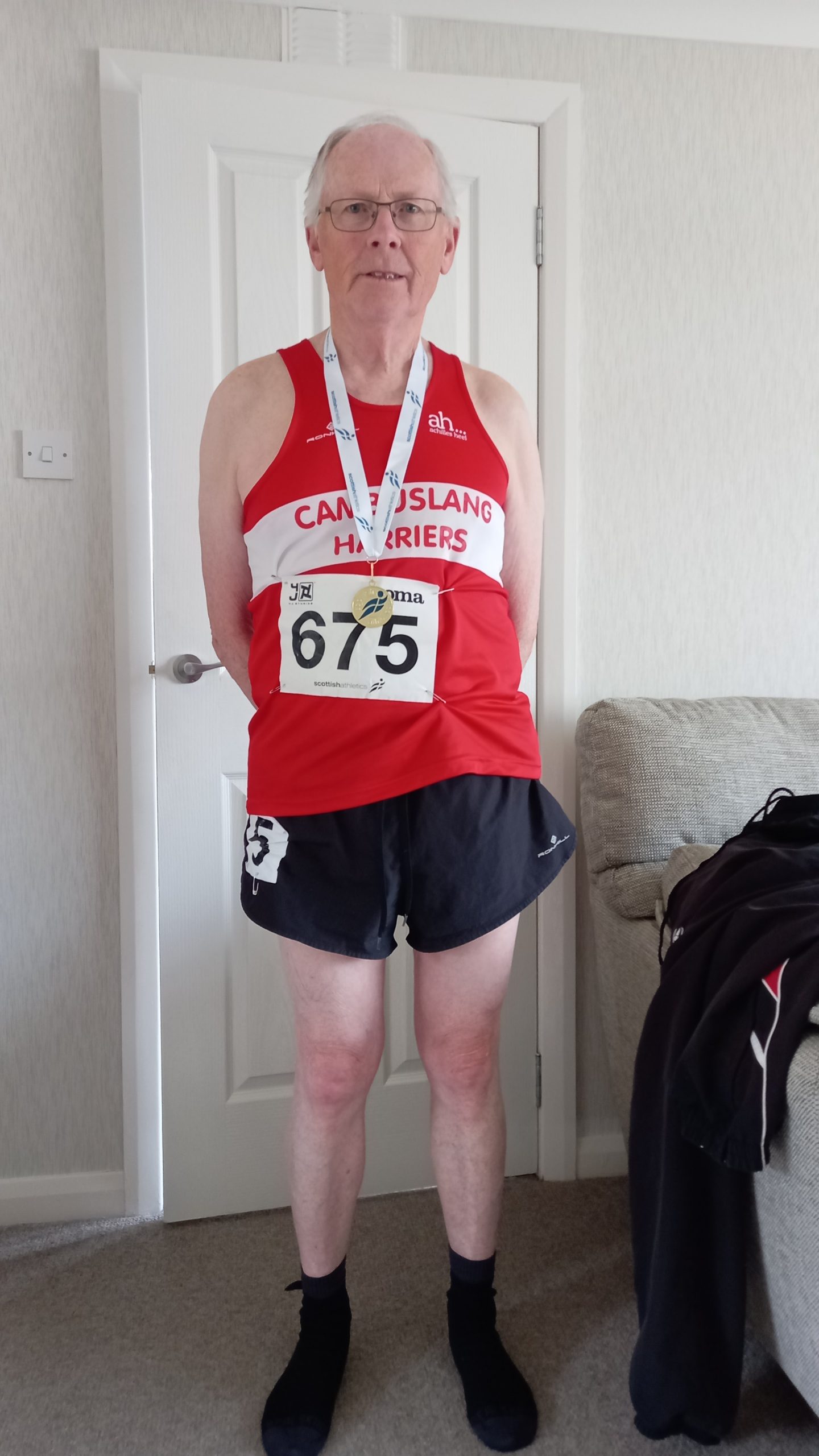 Like all athletes, Iain’s championships and racing generally were seriously upset by the Covid pandemic which swept the entire world and he next appears in a championship in 2023. That year he ran in the Scottish Masters indoor championships in Glasgow, finishing 1st M45 in the 800m in 2:08.44 and 4th in the 1500m in 4:40.98. He was still running in the cross-country and road programme through the winter and was seen in many championships including Dunbartonshire, Renfrewshire, six-stage road relay, west district relay and national relay championships. His track form seemed to have shaded off a bit in 2024 causing him to miss all the Scotttish Athletics League fixtures but he was well to the fore again in the Scottish Masters championships where he was 2nd M45 in the 800m in 2:10.43 and first in the 1500 in 4:41.10. These times were season’s bests with a 63.44 for the 400m.